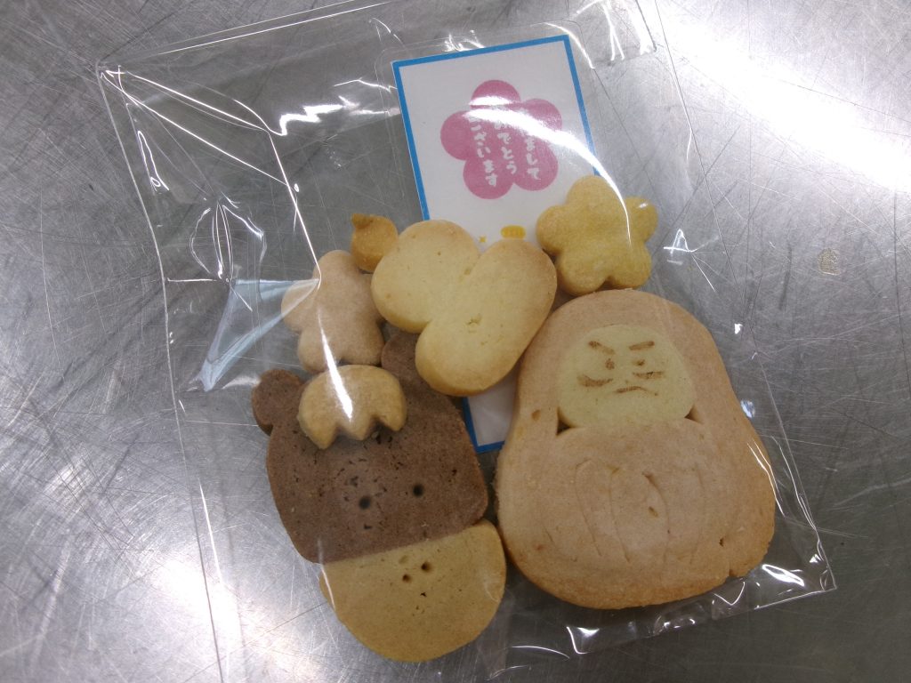 お正月にちなんだ うま・だるま・鏡もち・梅 の形のクッキーにおみくじも一緒に袋詰めしましたよ。