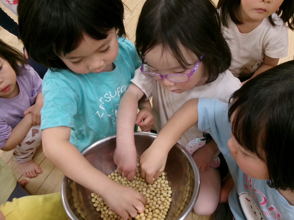 乾燥大豆を触ると「かたーい!」「カラカラいってる」とみんな興味津々です。