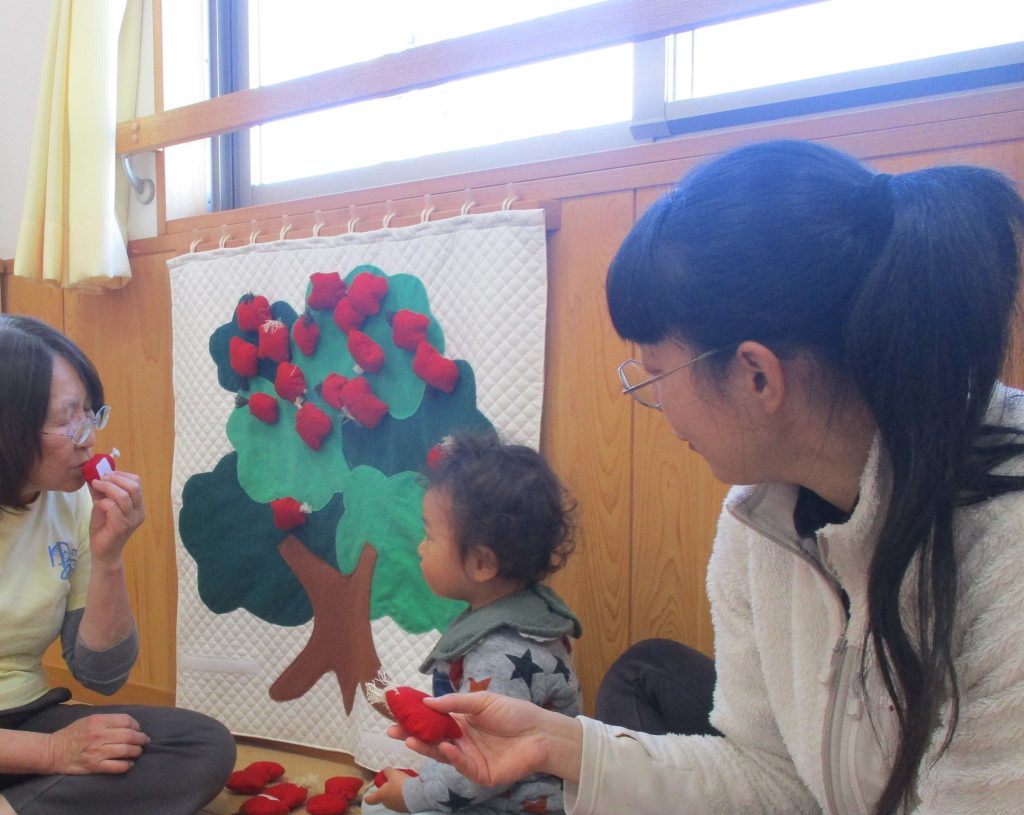 園内の乳児クラスの手作りおもちゃを紹介したり、ままごとの遊び方を