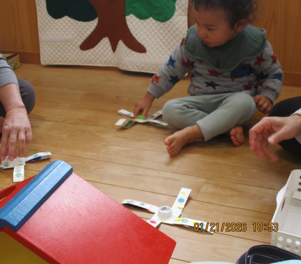 1歳クラスのこどもたちの作ったコマの色や形にも興味を示して
